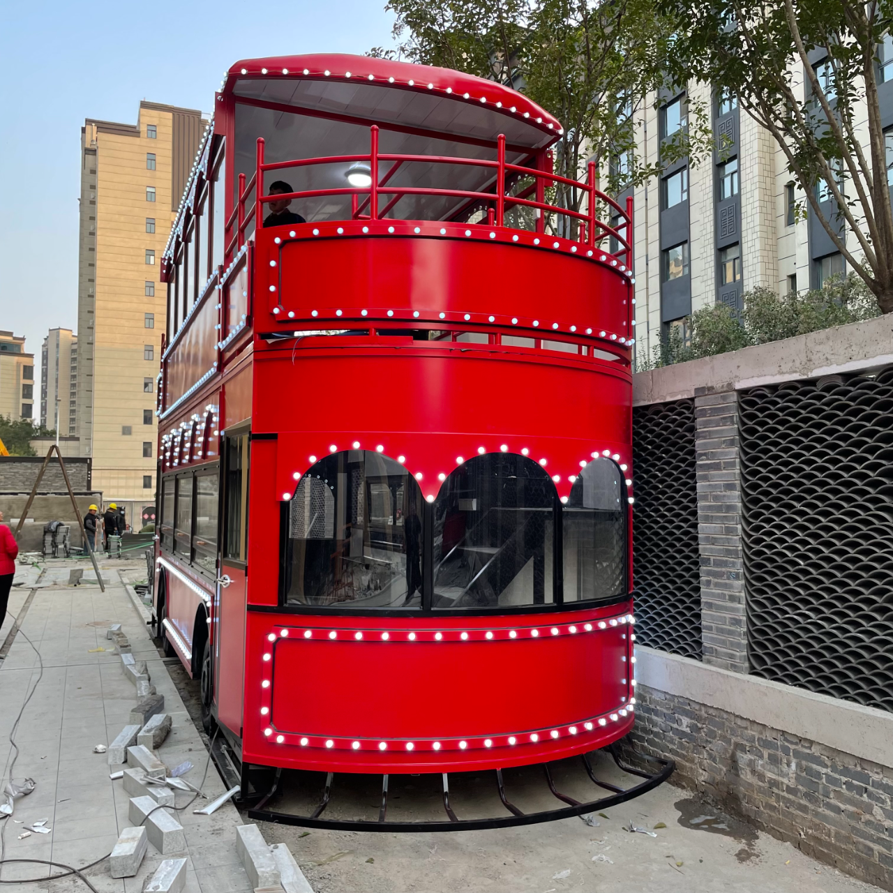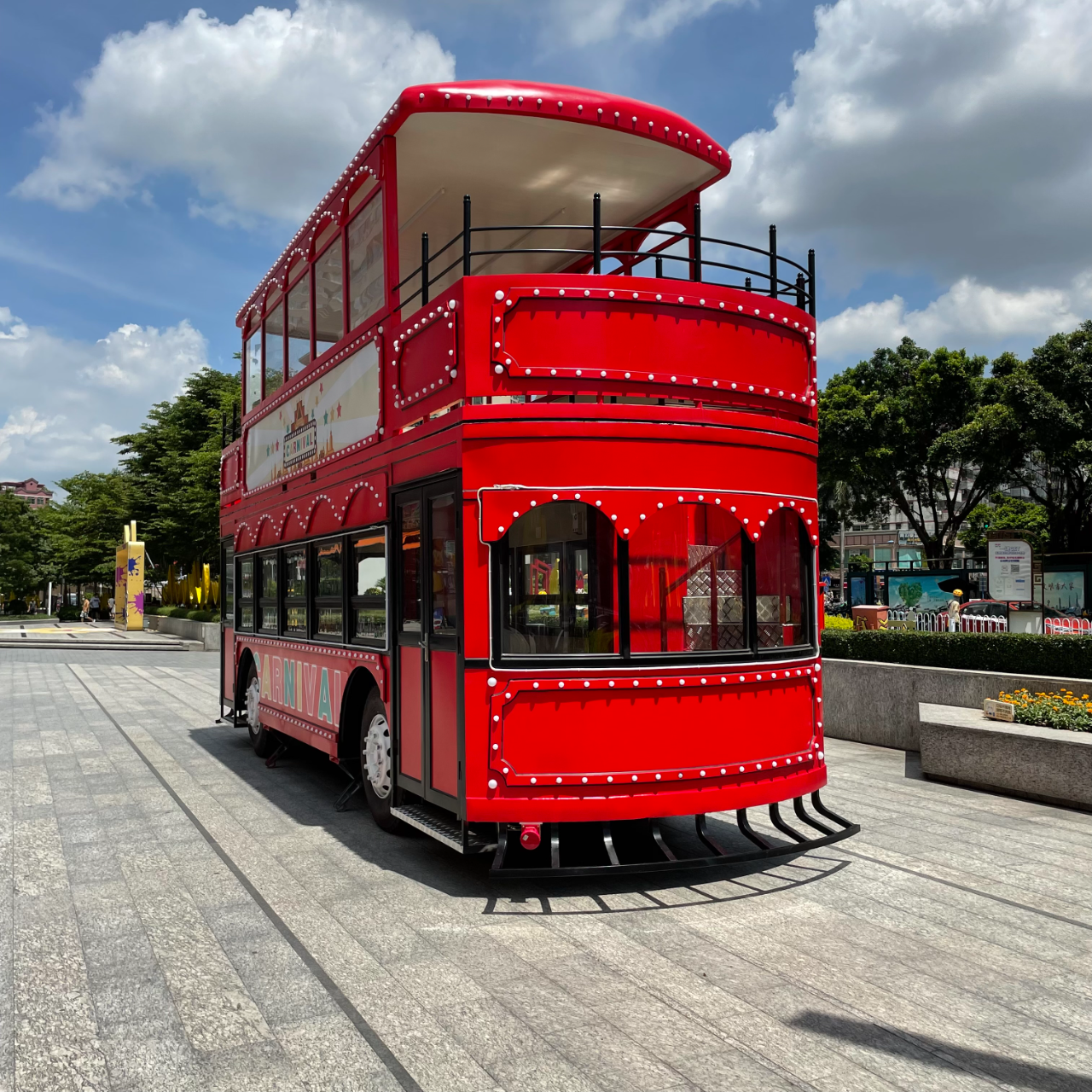 Double Decker Electric Food Truck ( converted from a double-decker bus) is designed for large outdoor mobile catering. The first floor is equipped with full kitchen equipment (including stoves, refrigerators, dishwashers) to complete the whole process of food preparation; the second floor is an open dining area that can accommodate 15-20 people. The main body is made of reinforced steel and heat-insulating glass, with a total weight of about 6000kg. It is electrically driven and suitable for outdoor roads. With a modern and luxurious design, the upper and lower floors are connected by a built-in staircase, balancing operational efficiency and dining experience.
